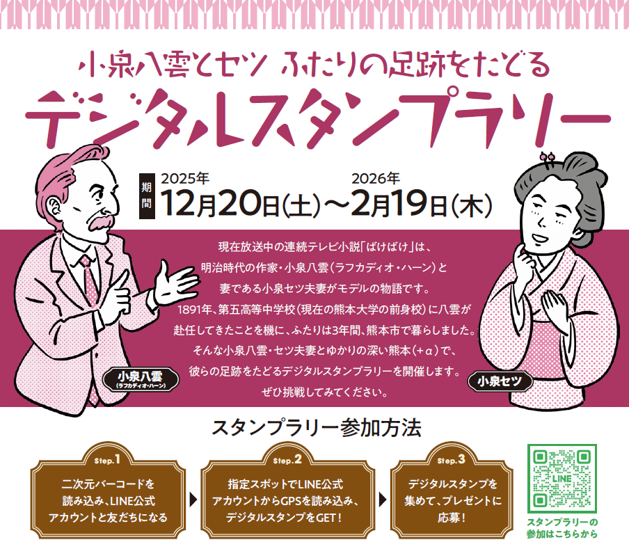 期間:2025年12月20日~2026年2月19日現在放送中の連続テレビ小説「ばけばけ」に登場する、明治時代の作家・小泉八雲(ラフカディオ・ハーン)とその妻・セツをモデルにした物語にちなんだ企画。八雲夫妻が3年間暮らした熊本市を中心に、ゆかりの地を巡るスタンプラリーです。