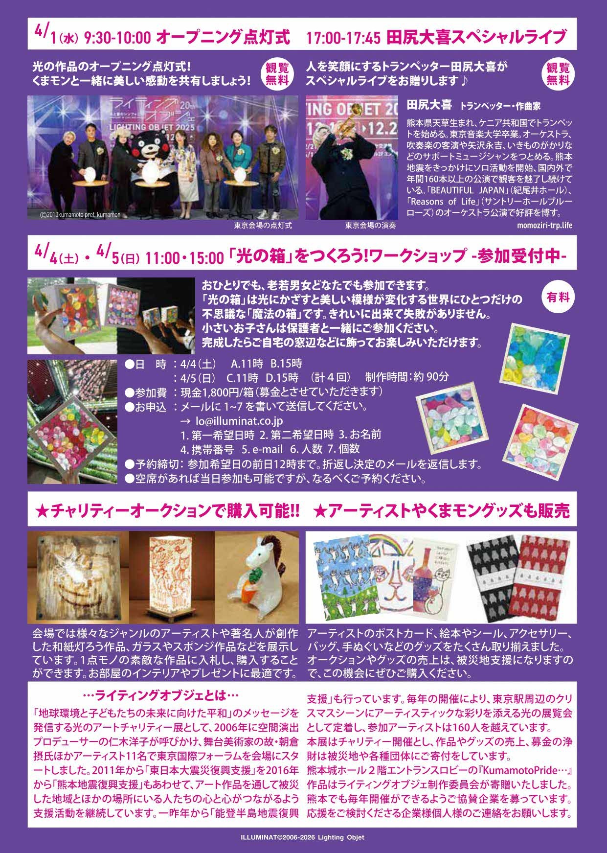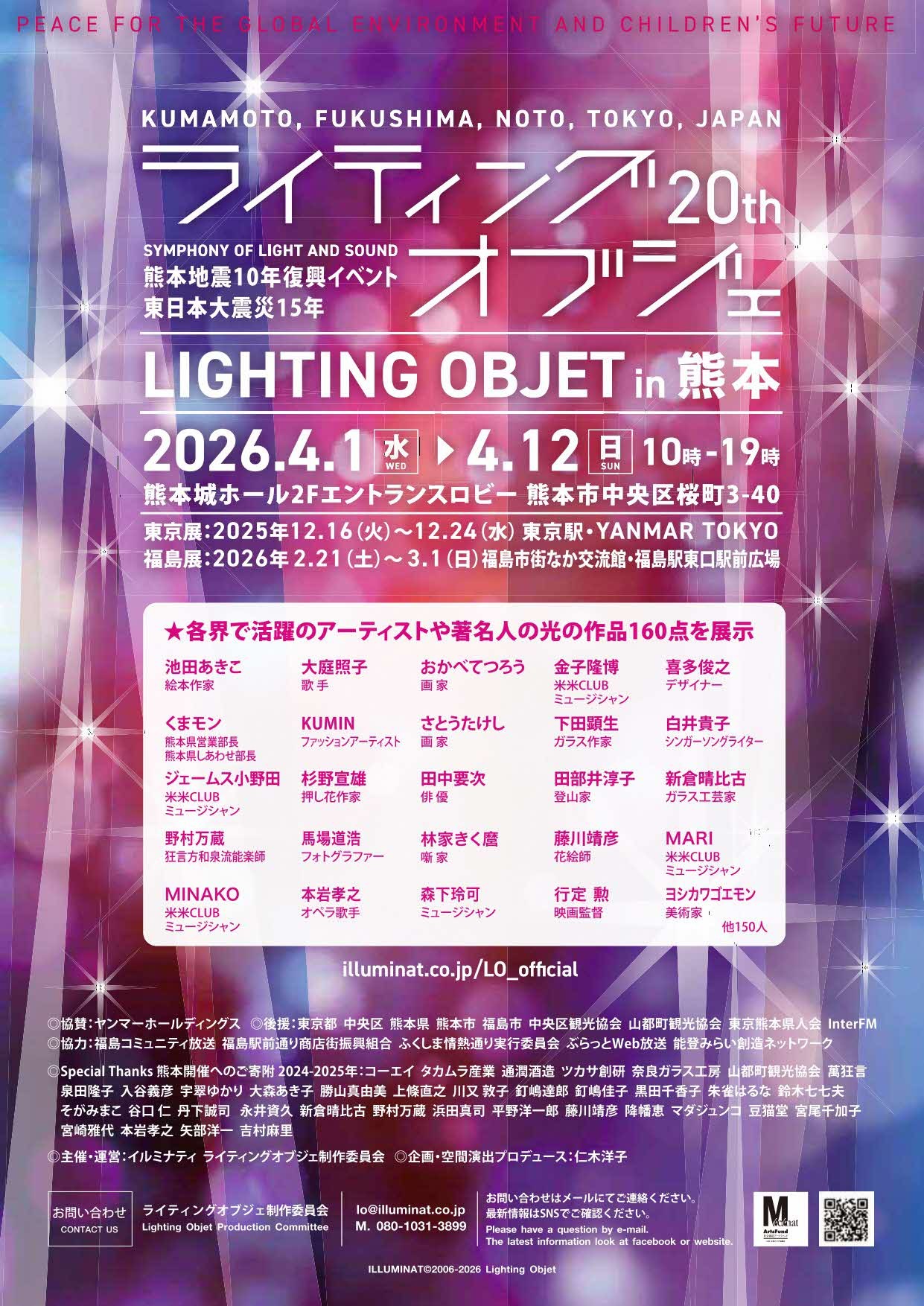 期間:2026年4月1日(水)~12日(日)2006年の東京開催から今年で20回目を迎えるチャリティーアート展。東日本大震災や熊本地震の復興支援の継続を首都圏で呼びかけ、被災地、福島・熊本・能登で巡回展を開催。160人を超えるアーティストや著名人の応援の心や気持ちを光のアート作品や交流イベントに込めています。熊本地震から10年の節目に合わせ開催します。