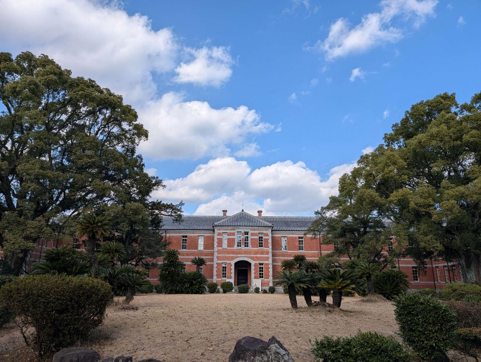 小泉八雲(こいずみやくも)や夏目漱石(なつめそうせき)が教鞭をとった旧制第五高等学校(現在の熊本大学)の前身である、第五高等中学校の校舎として明治22年(1889年)に完成した建物です。「ナンバースクール」と呼ばれていた旧制高等学校である第一高(現在の東京大学)から第八高(現在の名古屋大学)のうち、当時の校舎が同じ場所に同じ姿で現存するのはこの五高記念館のみ。化学実験室、通称赤門(あかもん)と呼ばれる正門、そして校舎の設計図とともに国の重要文化財に指定されています。100年以上もの長い間、赤レンガの美しい姿を保つこの英国風の学舎は、熊本大学のシンボルとして学生や熊本市民にも親しまれ、平成5年に記念館として一般公開されるようになりました。内部には、復原教室など6つの常設展示室があり、五高の歴史や赤レンガの校舎の構造、夏目漱石が作った試験問題など著名な教授陣に関する貴重な資料のほか、各界で活躍した卒業生に関する資料などが展示されています。
