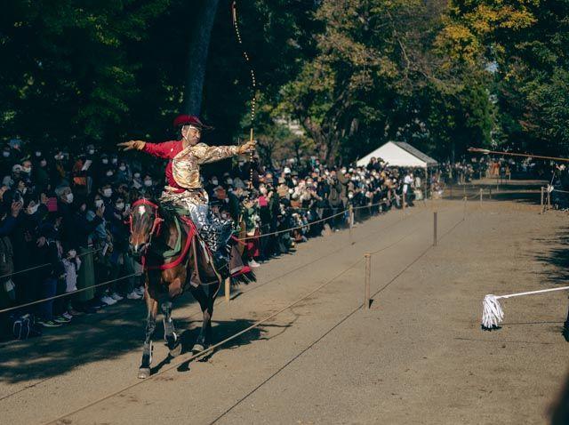 In a yabusame exhibition, archers take turns riding their horses at a fast gallop down a 220m track while shooting arrows at three separate targets. Between shots, archers have a mere seven seconds to pull an arrow from their belt, nock the arrow, pull back, aim, and fire, all without touching the horse or the reins with their hands.