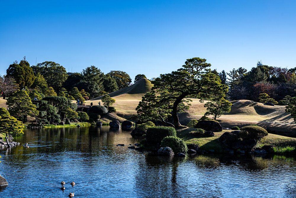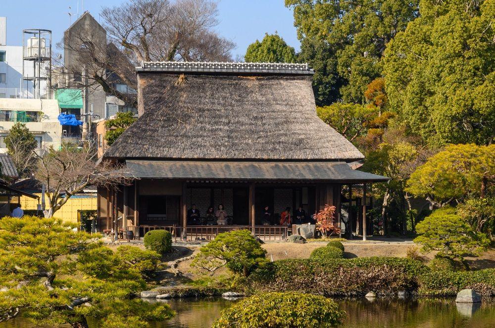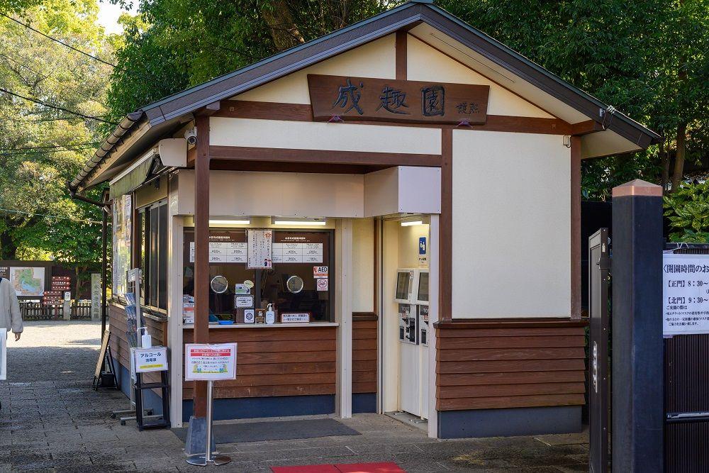 Upon entering, the main areas of the gardens are: Izumi Shrine to the left; the central pond and grounds in the center; and the Kokindenju no Ma teahouse slightly to the right. Let’s visit the teahouse first.